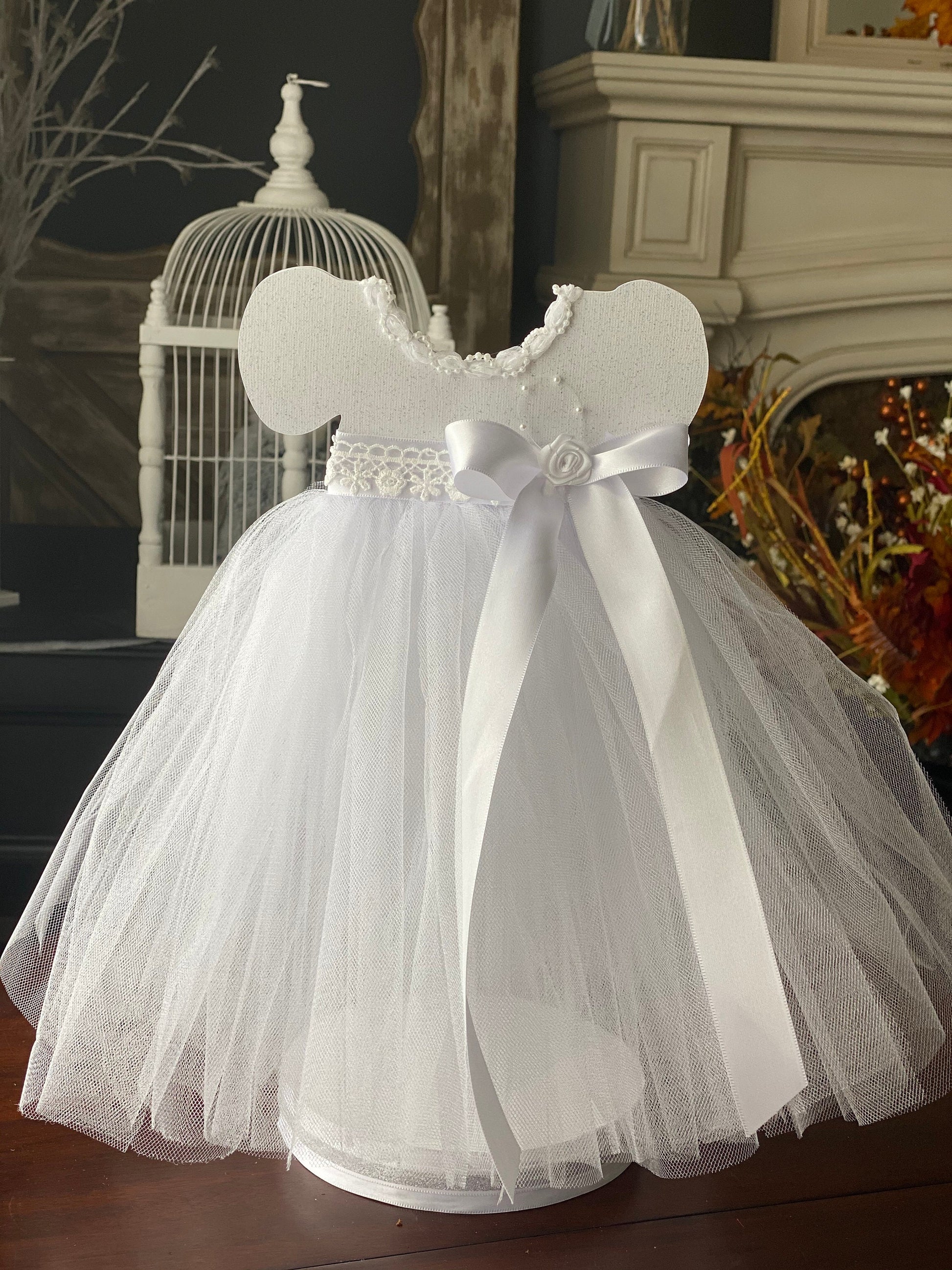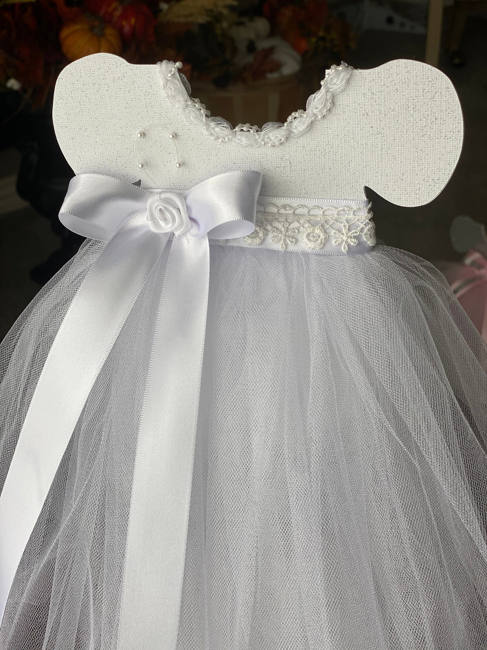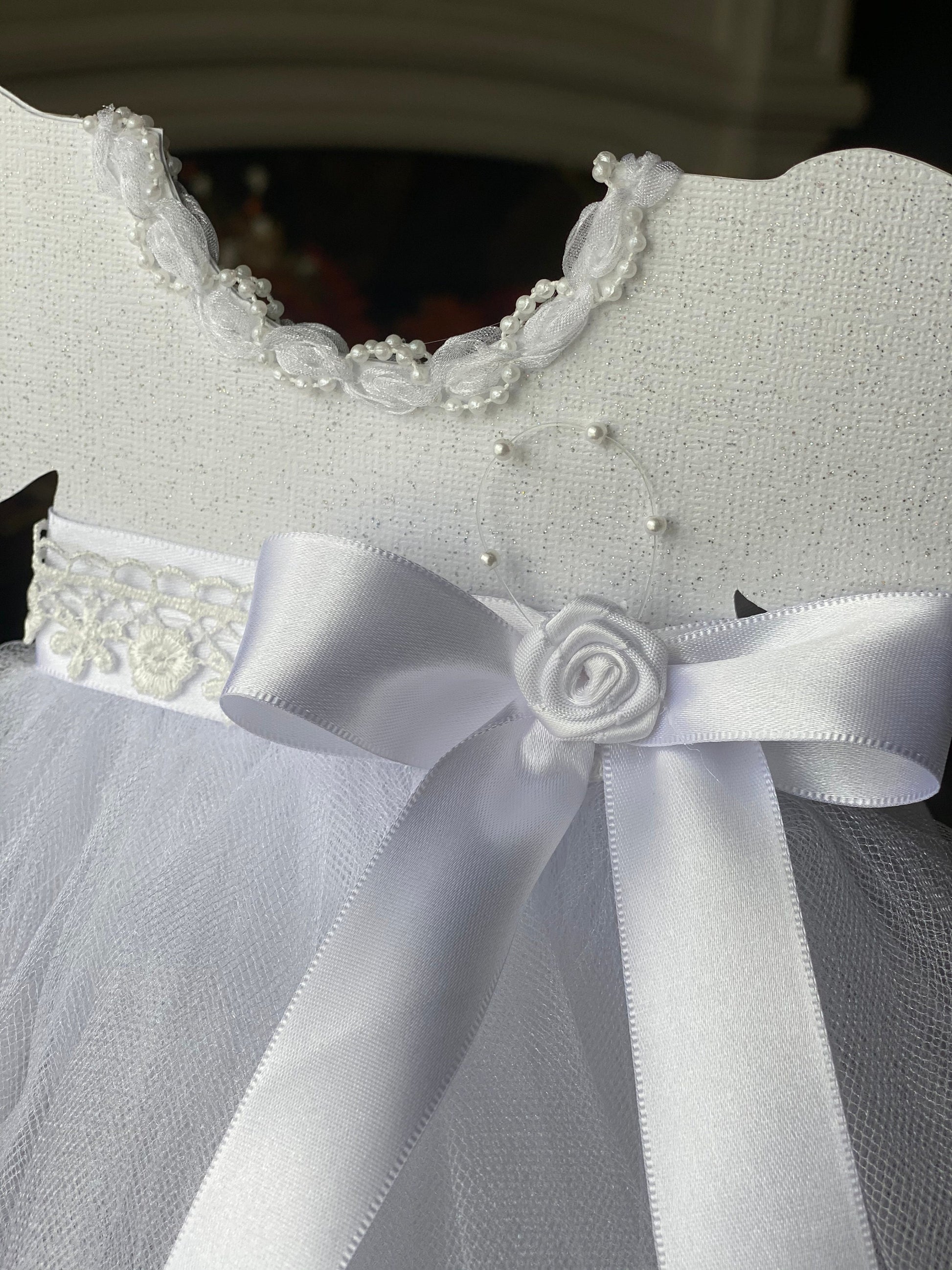 The dress flows beautifully with White tulle and is accented with soft White satin bows and is finished with a trim around the neckline