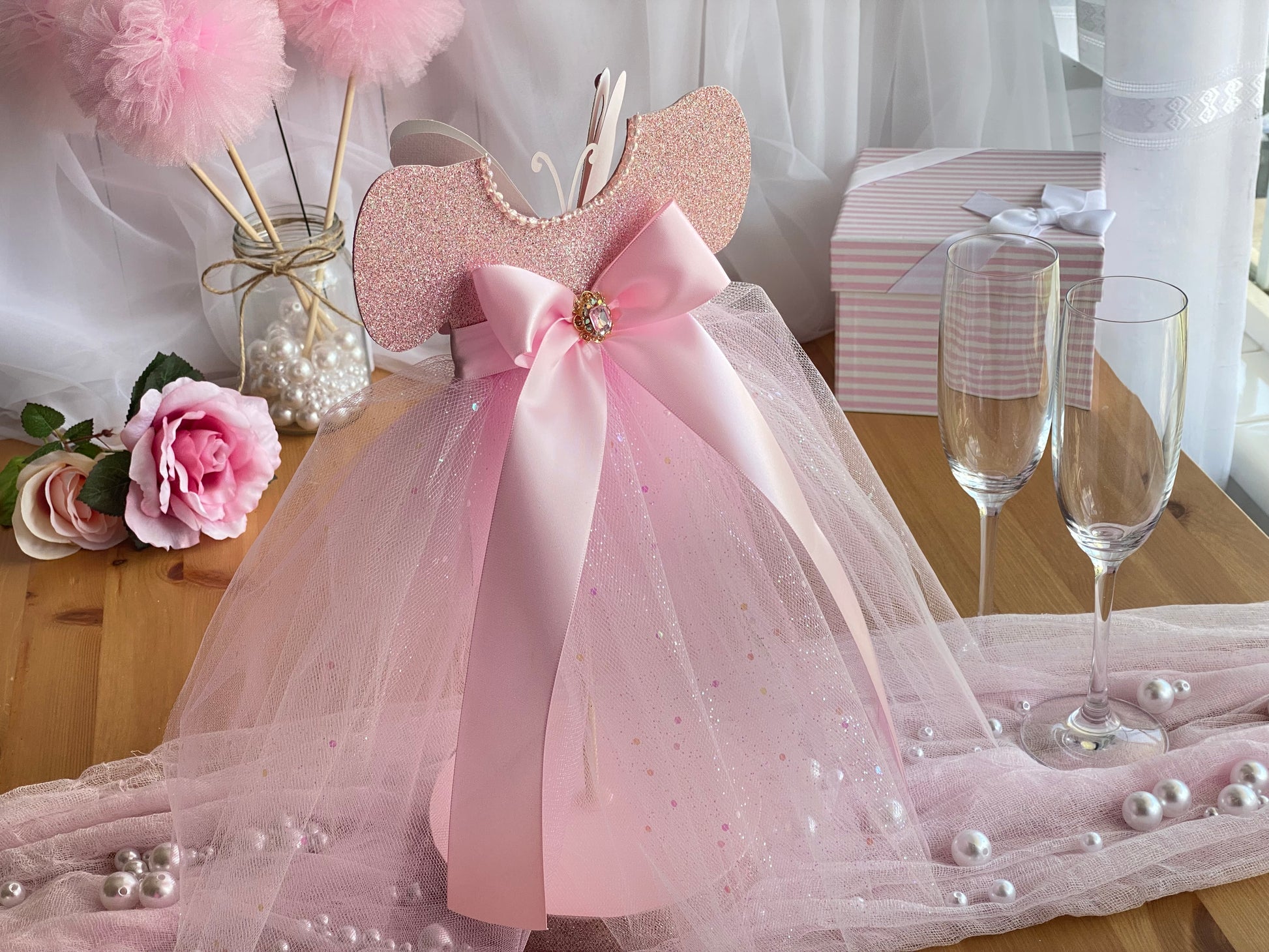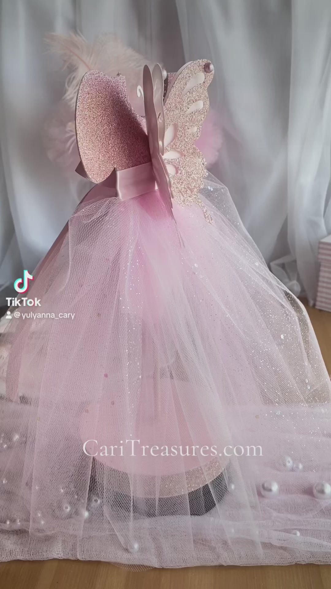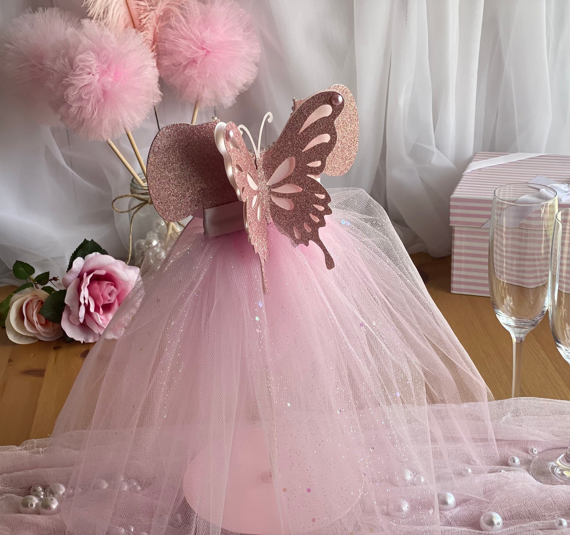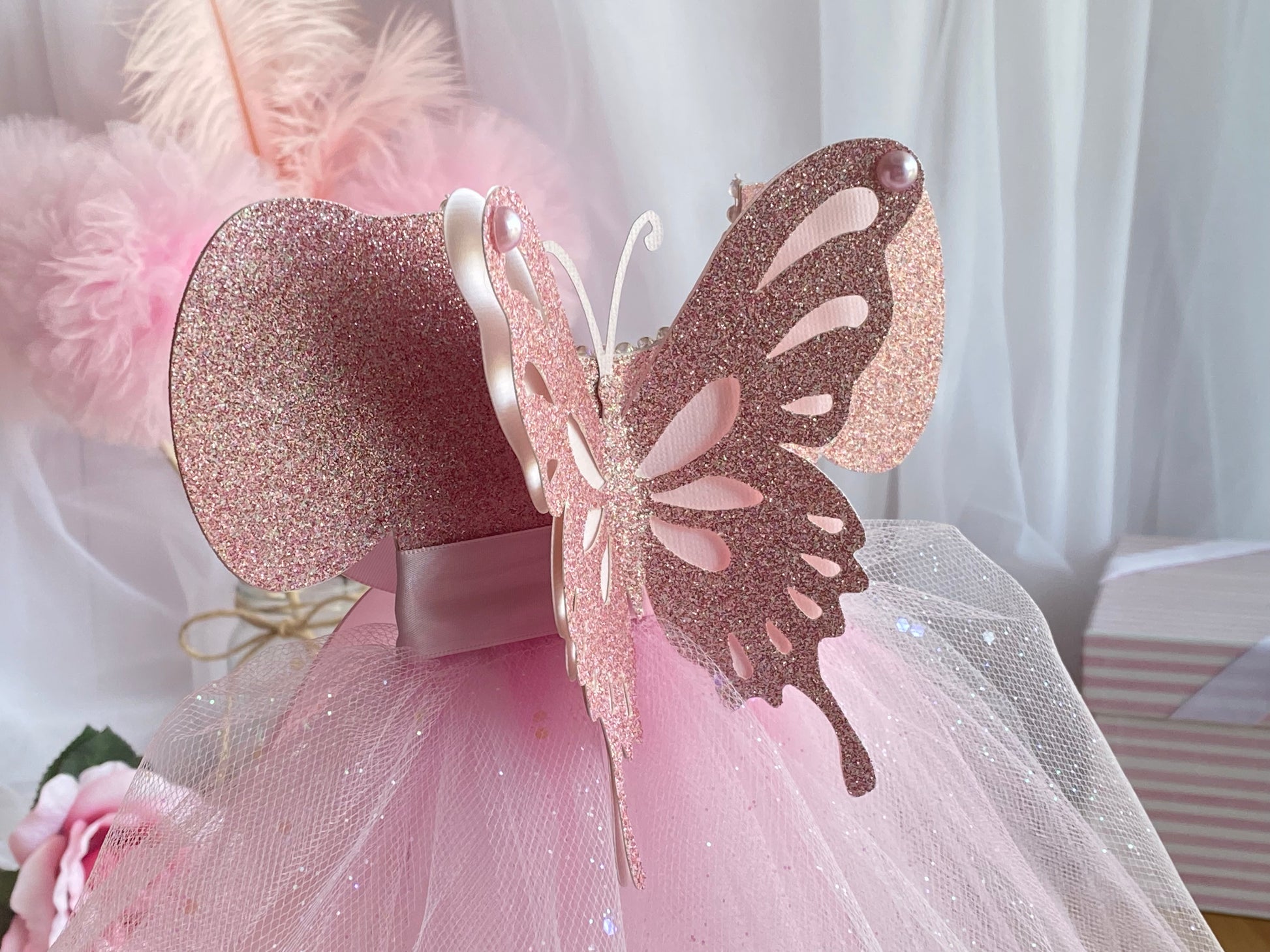 The dress flows beautifully with Pink tulle and is accented with soft Pink satin bows and is finished with a trim around the neckline, with Butterfly