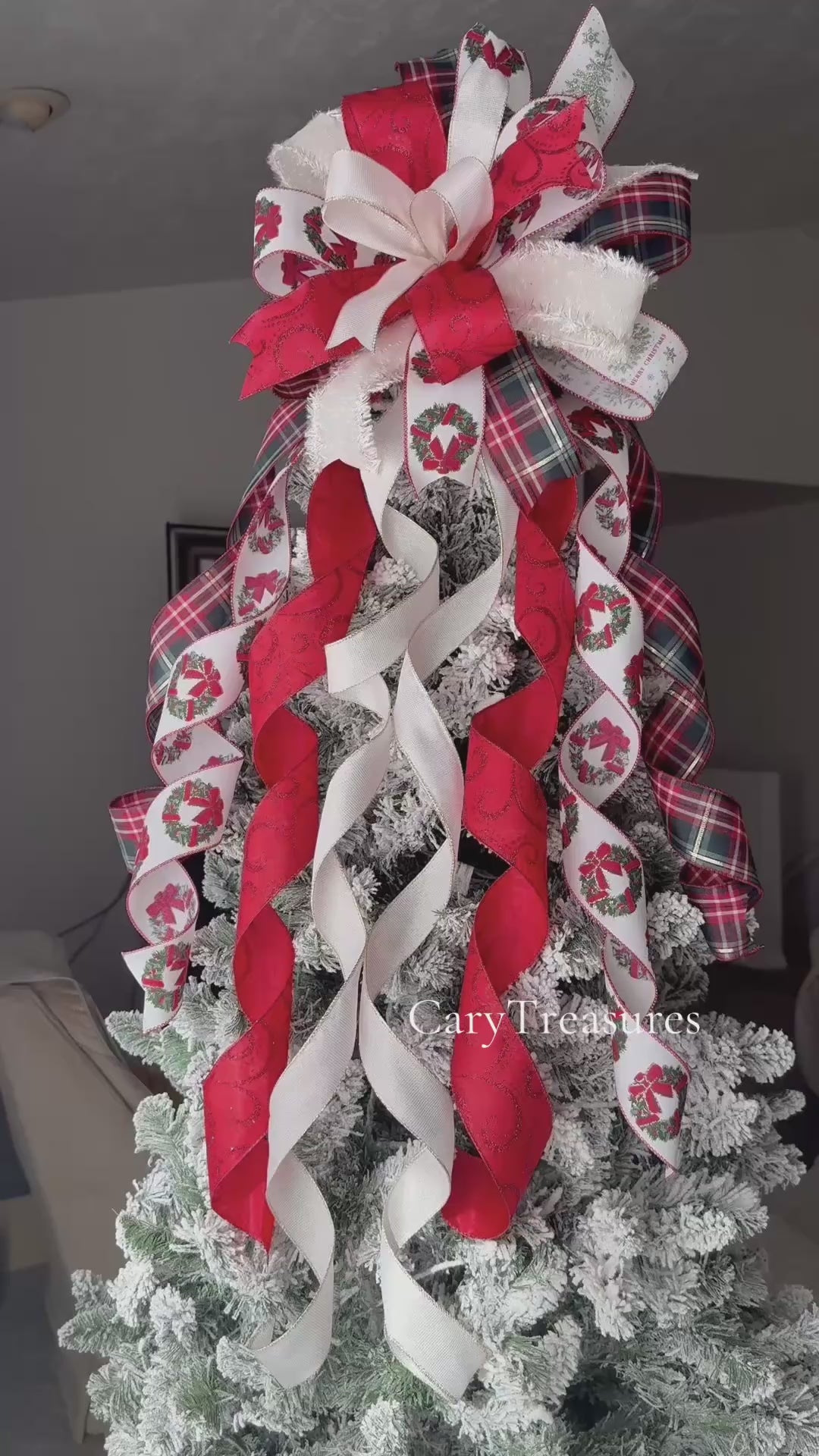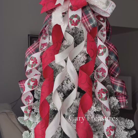 Add the perfect finishing touch to your Christmas tree with this beautiful Christmas bow in shades of red, plaid and beige. Handmade with high-quality ribbons, this tree topper bow is ideal for adding a festive, elegant, and sparkly look to your Christmas decorations.